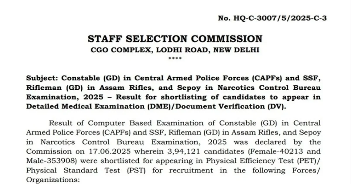 SSC has declared the result of CBT exam of Constable (GD) in Central Armed Police Forces (CAPFs) and SSF, Rifleman (GD) in Assam Rifles, and Sepoy in Narcotics Control Bureau Examination, 2025 on July 17, 2025 wherein 3,94,121 candidates (Female – 40213 and Male-353908) were shortlisted for appearing in Physical Efficiency Test (PET)/ Physical Standard Test (PST) for recruitment in the BSF/ CAPF/ CRPF/ SSB/ ITBP/ AR/ NCB/ SSF.